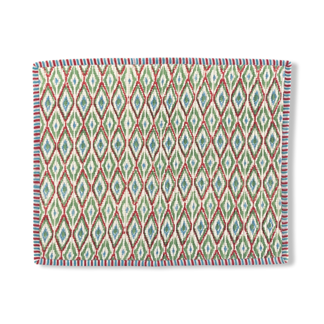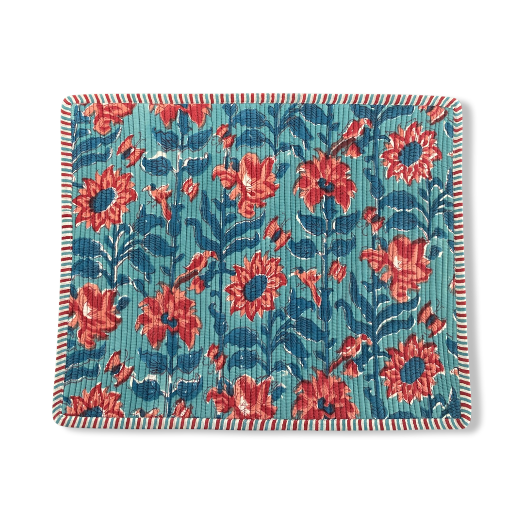 Each Placemat is Hand block printed made with Cotton fabric. With a 5 layer quilt that includes a high density foam and two layers of lining.